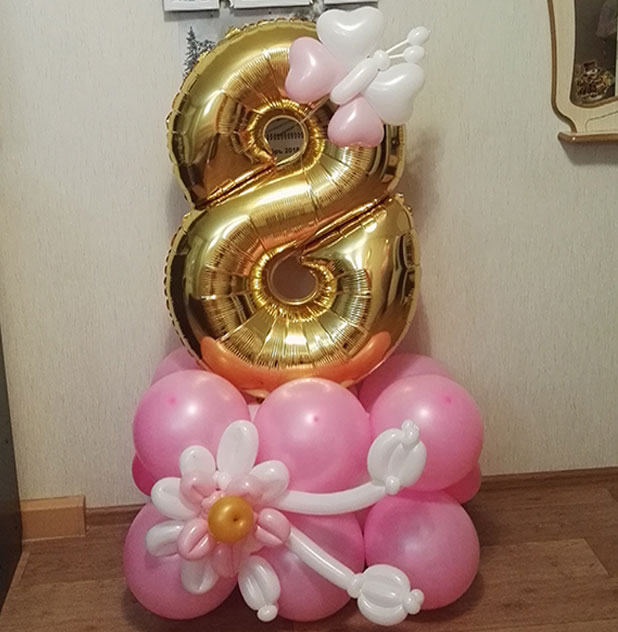 Золотая цифра 8 на розовой подставке с украшением и бабочкой.