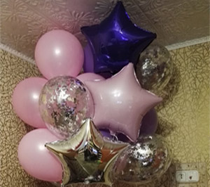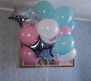 Нежный фонтан из розовых-бирюзовых-белых шаров с серебристыми звездочками.