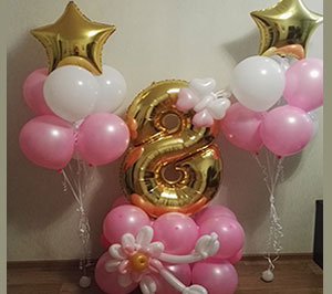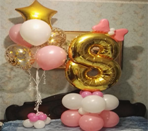 Золотая цифра 8 на розовой подставке с украшением и бабочкой.